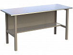 Верстак комплектуется полкой-стенкой, расположенной под столешницей для удобного размещения габаритного инструмента и оснастки. Опорные элементы выполнены сварными из холоднокатаной стали. Все металлические элементы покрыты полиэфирной порошковой краской. Столешница из фанеры толщиной 24 мм, которая покрыта листом оцинкованной стали толщиной 1,2 мм. Глубина столешниц 696 мм. Максимальная масса груза на столешнице - 350 кг.