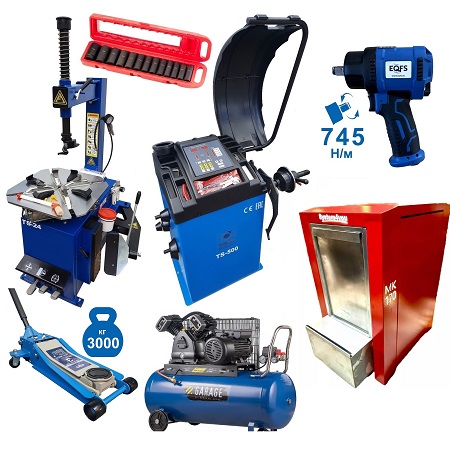 Комплект: шиномонтажный станок TS-21 для дисков: внешний 11÷20” + пистолет с манометром для подкачки шин + монтажка + пластиковые накладки на зажимные кулачки + регулятор давления с влагоотделителем и манометром. + TS-500 балансировочный станок с автозапуском, для колес легковых автомобилей и легких грузовиков, диаметр диска с резиной до 760 мм. размеры диска: ширина 3"–9” (76-228 мм), диаметр диска  10"–21” (254-533 мм). + кожух защитный + клещи + кронциркуль + быстрозажимная гайка + набор конусов + подкатной домкрат г/п 3,0т. 130-465мм. + ударный пневмогайковерт 1/2" крутящий момент 745Нм +  шланг кислородный 9мм 20Атм. 10м