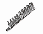 Головки изготовлены из закаленной хром-ванадиевой стали. Полированная поверхность. В набор входит планка крепления и хранения головок.Набор 9 предметов (Е10, Е11, Е12, Е14, Е14, Е16, Е18, Е20, Е22, Е24).