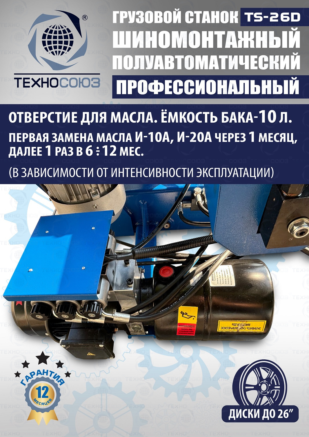 Гарантийные обязательства не действуют при использование шиномонтажного стенда не по назначению, а также в случае механических повреждений. Уважаемые клиенты, при покупке просим учесть следующее: Подключение грузового шиномонтажного станка к сетям просим учитывать что моторы у этого стенда трехфазные. Подключайте провод заземления. После подключения обязательно проверить направление вращения электромоторов. Погрузку и выгрузку производить вилочным погрузчиком или краном. Во избежание проблем с погрузкой желательно приезжать на БОРТОВЫХ машинах с длиной борта не менее 3 м. Учитывайте климатические условия - При понижении температуры масло густеет – заливайте его с учетом температуры окружающей среды.