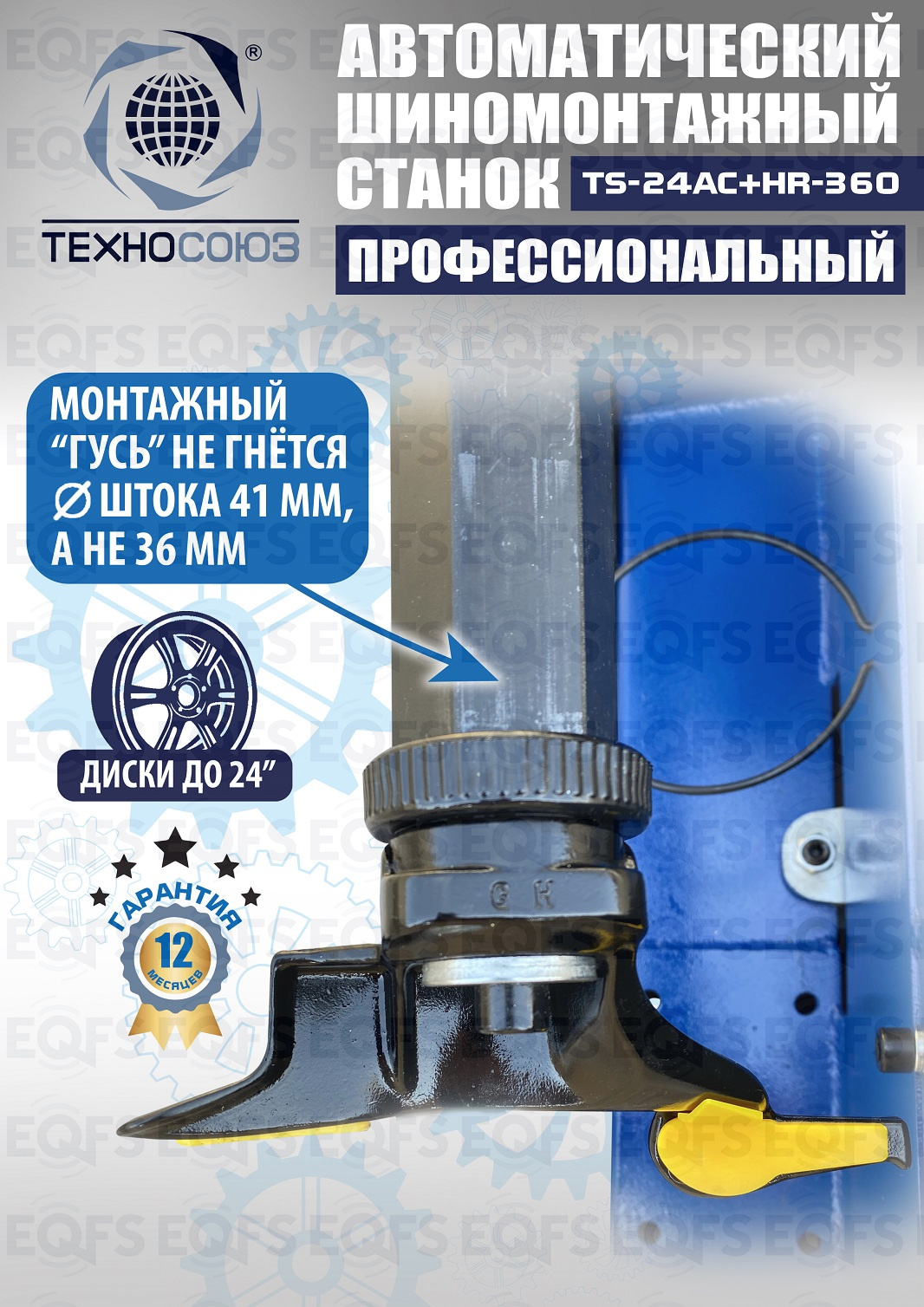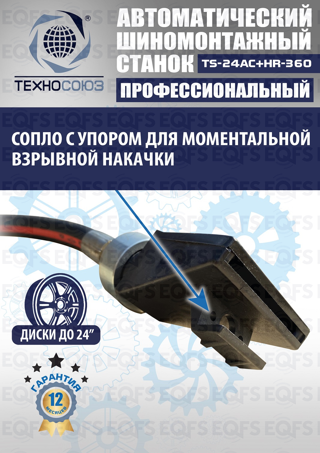 Автоматического шиномонтажного стенда TS-24AC+HR-360. В комплекте взрывная подкачка + третья рука для работы с низкопрофильными шинами и RanFlat! Для колес легковых автомобилей, легких грузовиков, микроавтобусов и коммерческой техники. Для дисков: внешний 10÷21”, внутренний 12÷24”. Напряжение 220/380В. Гарантия 18 мес. – наш монтаж, 12 мес. – самостоятельная установка.