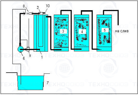 Сущность процесса заключается в последовательном выделении нефтепродуктов, находящихся в различной дисперсной фазе из сточных вод. Загрязненные сточные воды собираются в приямке (отстойнике).  Здесь происходит отстаивание крупных взвешенных частиц и нефтепродуктов. Загрязненная вода подается струйным насосом в флотационную емкость 1. Происходит выделение дисперсных нефтепродуктов. После аппарата напорной флотации вода подается в установленные последовательно механические  фильтры 3 и 4. Доочистка сточных вод до ПДК осуществляется на сорбционных фильтрах 5 заполненных активированным углем, сульфоуглем или другими природными или синтетическими материалами.