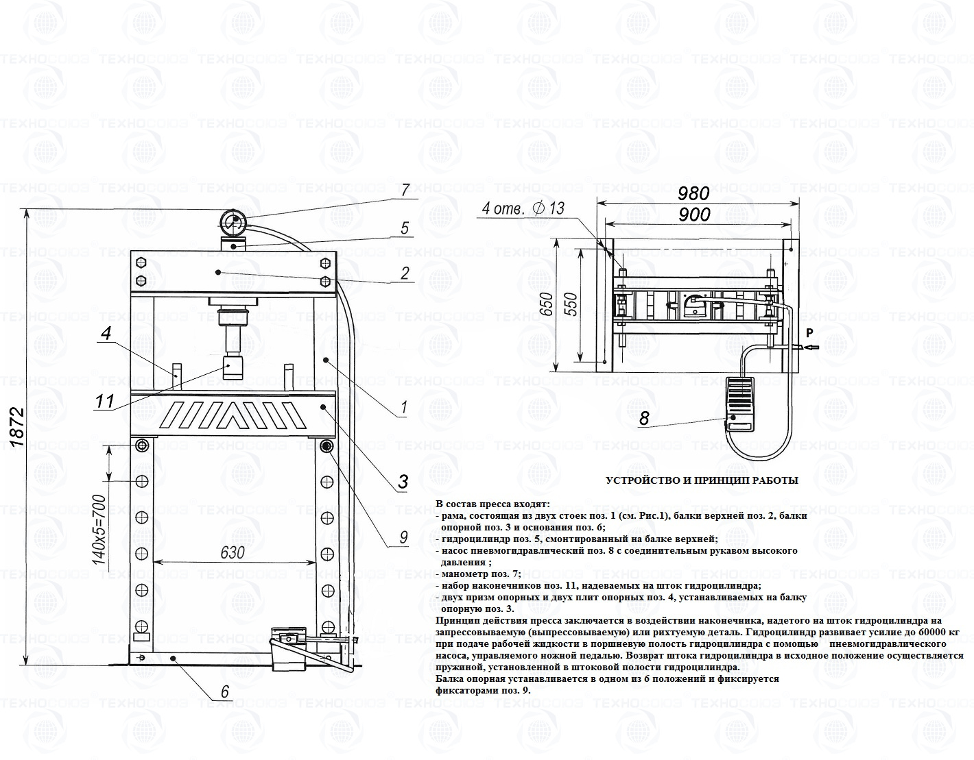 Рама пресса в сборе с гидроцилиндром и насосом ножным с соединительным рукавом высокого давления, шт.