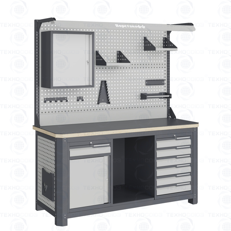 Нагрузка на столешницу 1500 кг. Столешница из листа влагостойкой фанеры марки ФСФ толщиной 40 мм и листом горячекатаной стали толщиной 5 мм. Рама верстака выполнена их холоднокатаной стали. Модуль верстака выполнен сварными. Ящики в модулях устанавливаются на шариковых телескопических направляющих полного выдвижения. Квадратная перфорация для установки крючков, держателей. Размеры: 1982x1493x743 мм