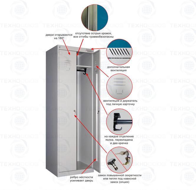 Подходит для оборудования производственных, образовательных, медицинских, военных учреждений, спортивных клубов, офисов и т.п. Шкаф может использоваться для хранения одежды, архивных документов, хоз.инвентаря.