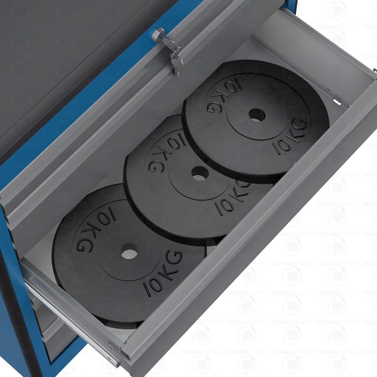 Максимально допустимая масса груза, равномерно распределенного по поверхности любого выдвижного ящика 30 кг. Максимально допустимая масса груза, равномерно распределенного по крыше тележки 25 кг. Максимально допустимая масса размещаемого груза в тележке 220 кг.  В тележке инструментальной TNC 950.5 Р установлены один малый и четыре средних ящика. Внутренние размеры малых ящиков: 60 х 561 х 392 мм. Внутренние размеры средних ящиков: 135 х 561 х 392 мм.