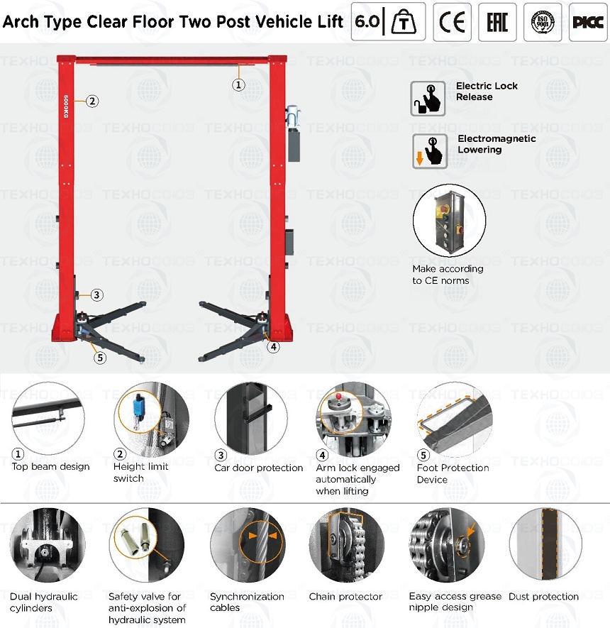 6.0т. Для длиннобазных и широких а/м. Верхняя синхронизация (чистый пол). Подъём 110÷1910мм. Между колоннами 3100мм. 220/380В. Все подхваты 3-х ступенчатые 930÷1900 мм.   Гарантия 24 мес. – наш монтаж, 12 мес. – самостоятельная установка. Съем со стопоров с пульта. Подъёмник автомобильный двухстоечный, оснащён ограничителем подъёма при достижении максимальной высоты.