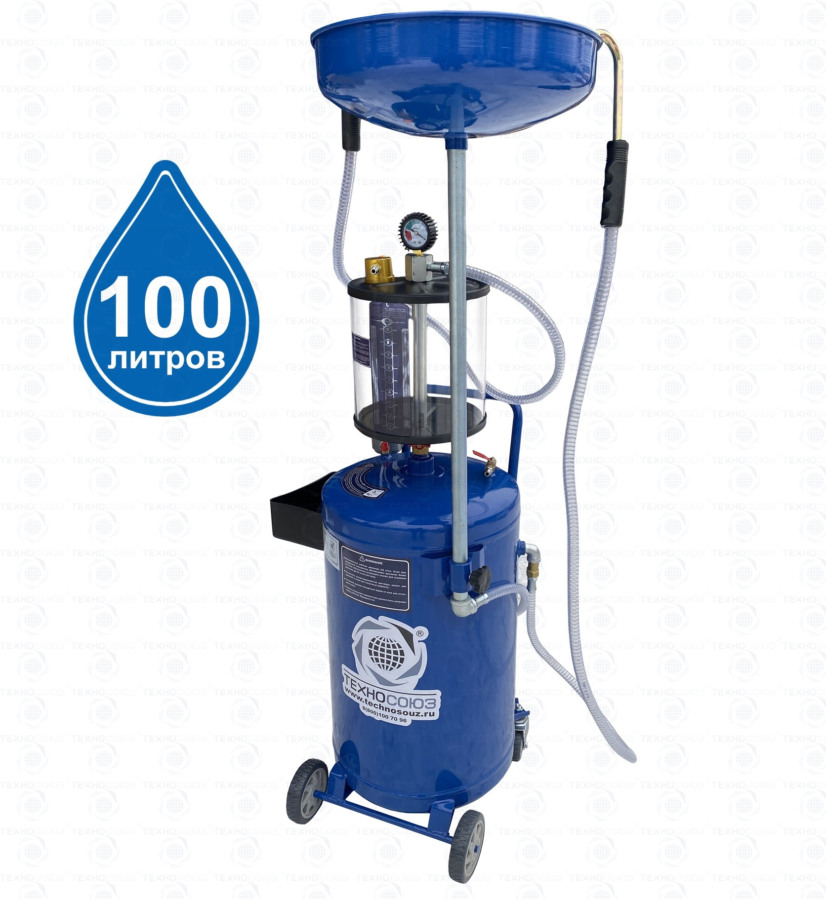 Маслосборник помещает 100 литров отработанного масла и антифриза. Бак 80л + Предкамера (колба) 10 л. + чаша (воронка) 10л.
