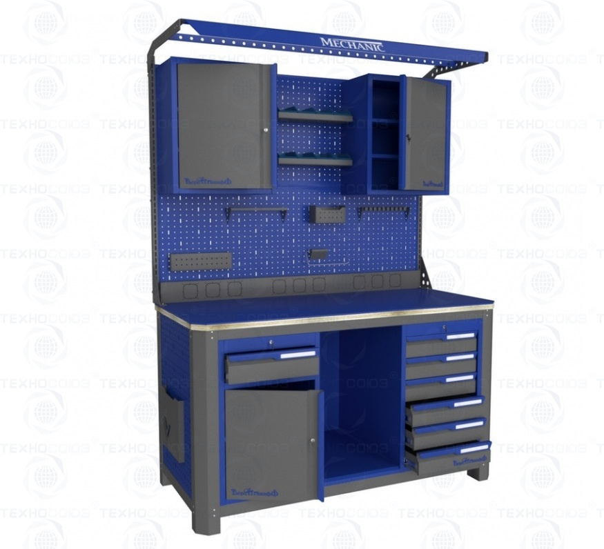 В состав рабочего места входит: Рама (металл 1,5 мм.), столешница (фанера 24 мм. + металл 6 мм.), 2 боковые перфорированные панели, модуль с дверцей и ящиком, полка-стенка, модуль с 6-ю выдвижными ящиками, блок розеток, комплект усиленных кронштейнов, 2 экрана, козырек с лампой освещения, навесной шкафчик, 2 полочки, 8 пластиковых контейнера, держатель универсальный, держатель для баллонов, держатель для ключей, держатель для отверток, держатель для бумажных полотенцев, кармашек.